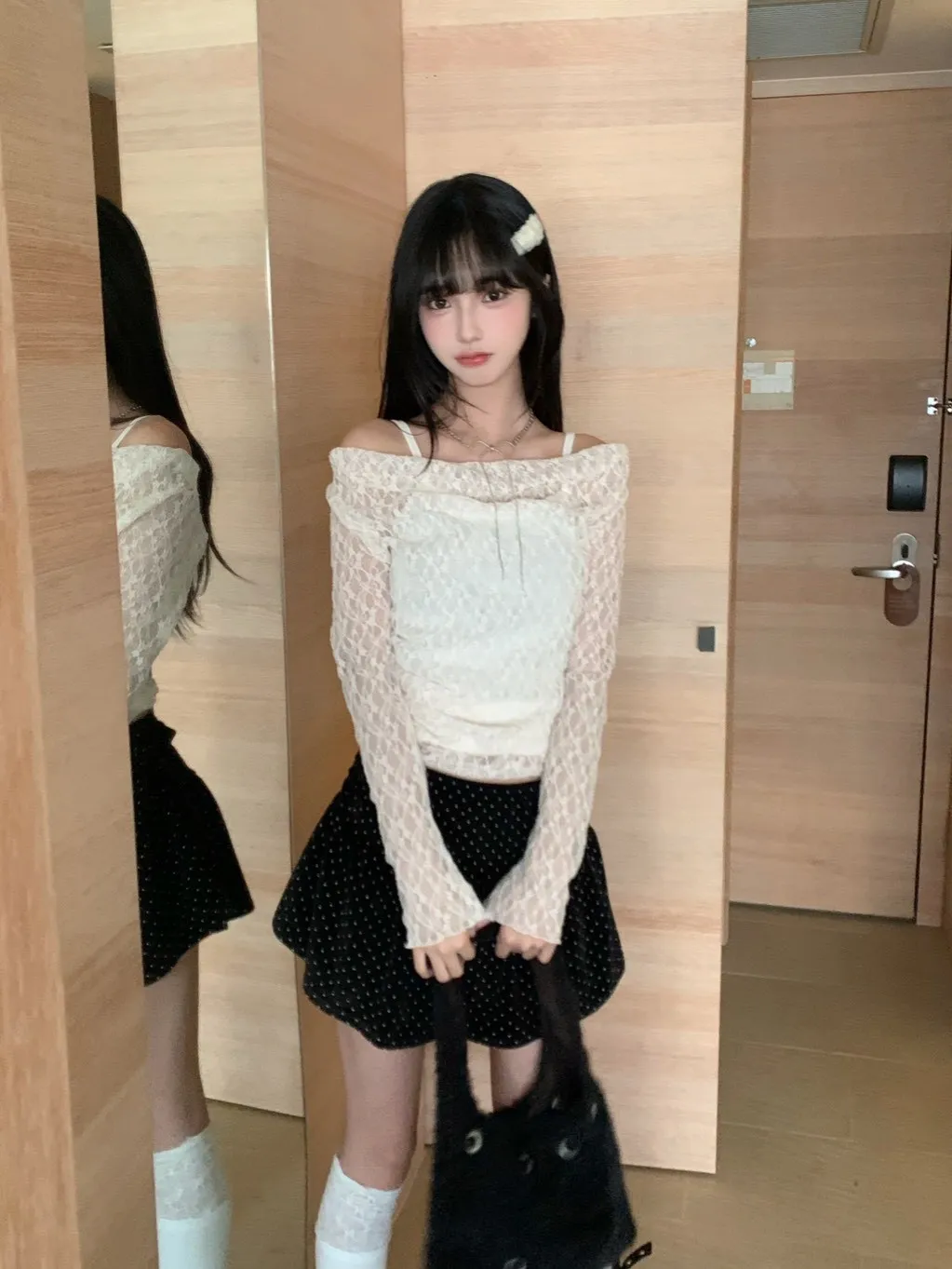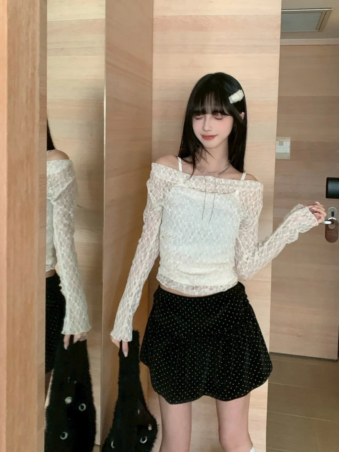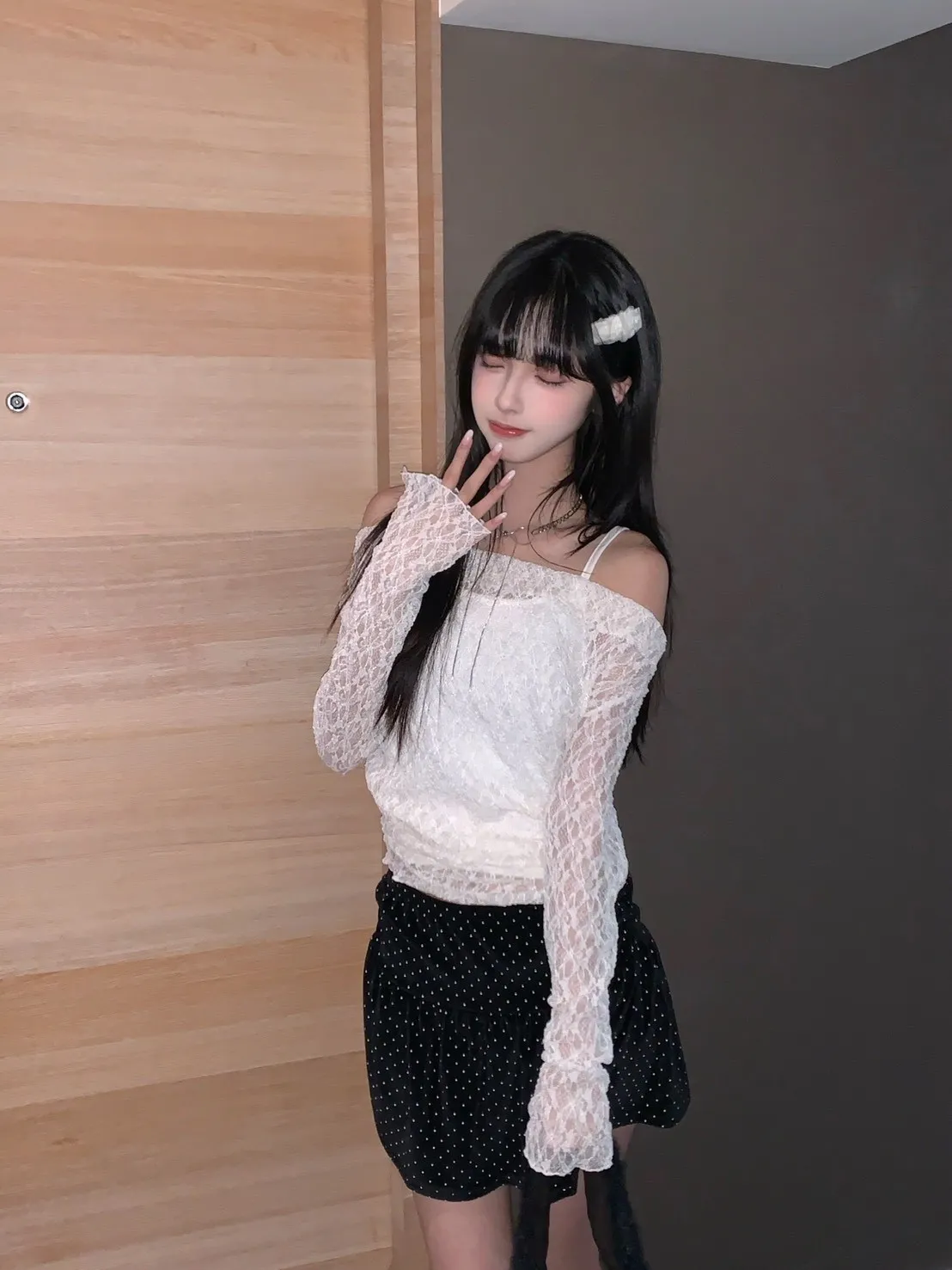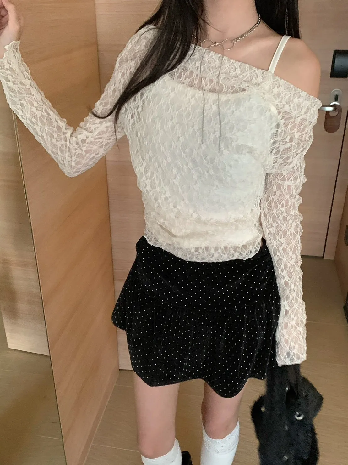 【韓國直送】星砂戀人1+1!蕾絲斜領上衣+背心