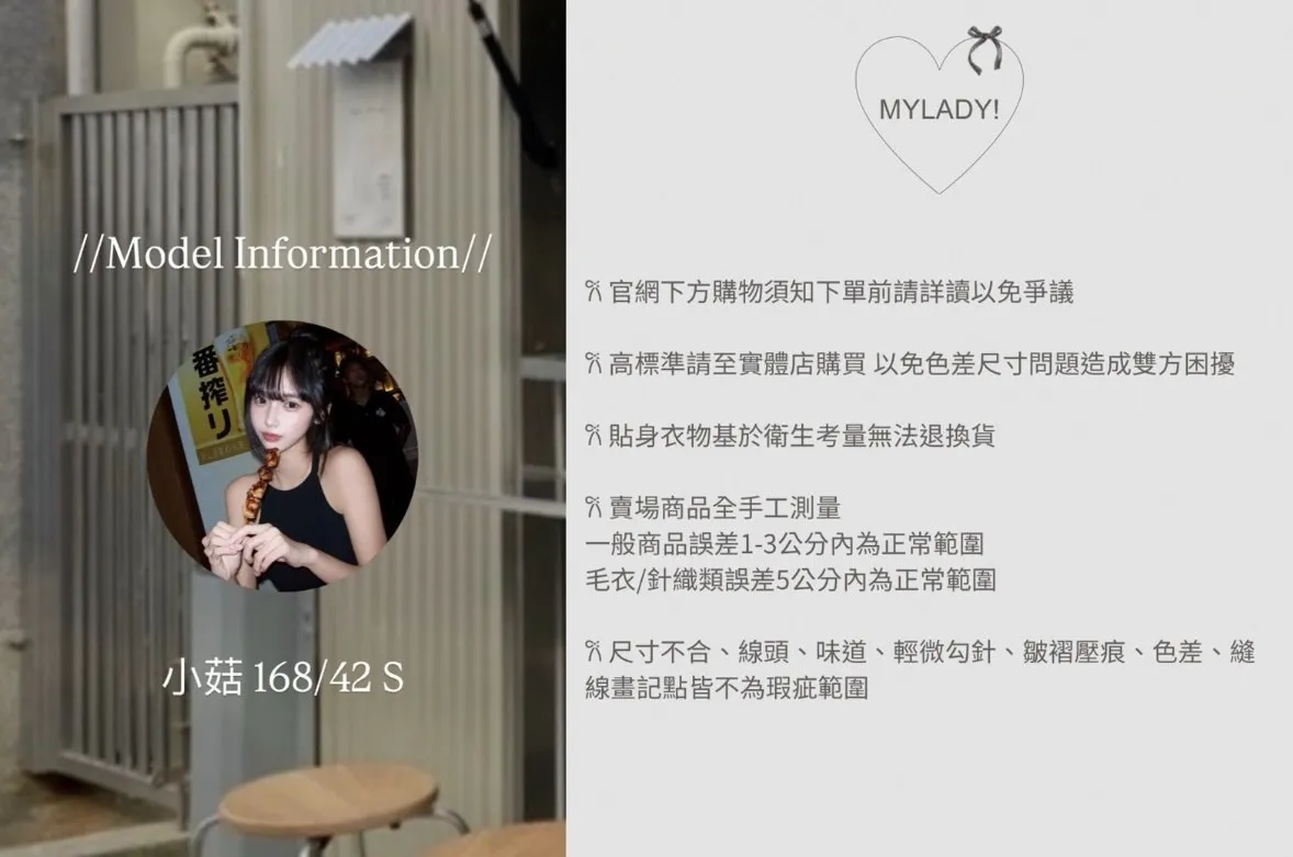 商品細節• 商品採現貨+預購 不接急單!!!•詳細貨況、預計到貨請私訊官方LINE客服查詢•韓國款商品因屬批市代購性質、故無提供鑑賞期•貼身衣物(小可愛、附bra上衣、內褲、襪子)無提供退換貨•以上更詳細購物需知於官網頁尾下方連結 購買視同同意米白 嫩粉 黑